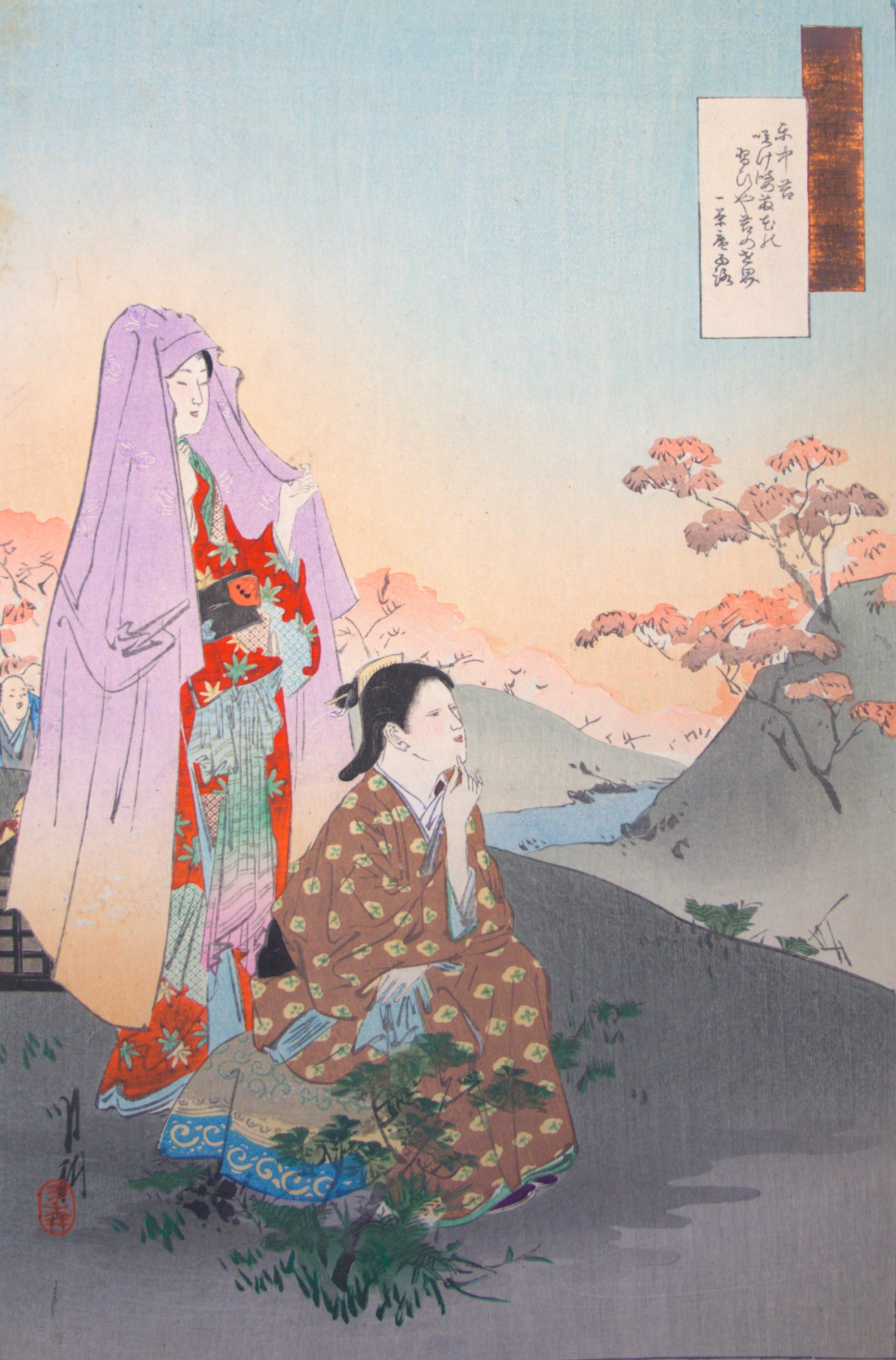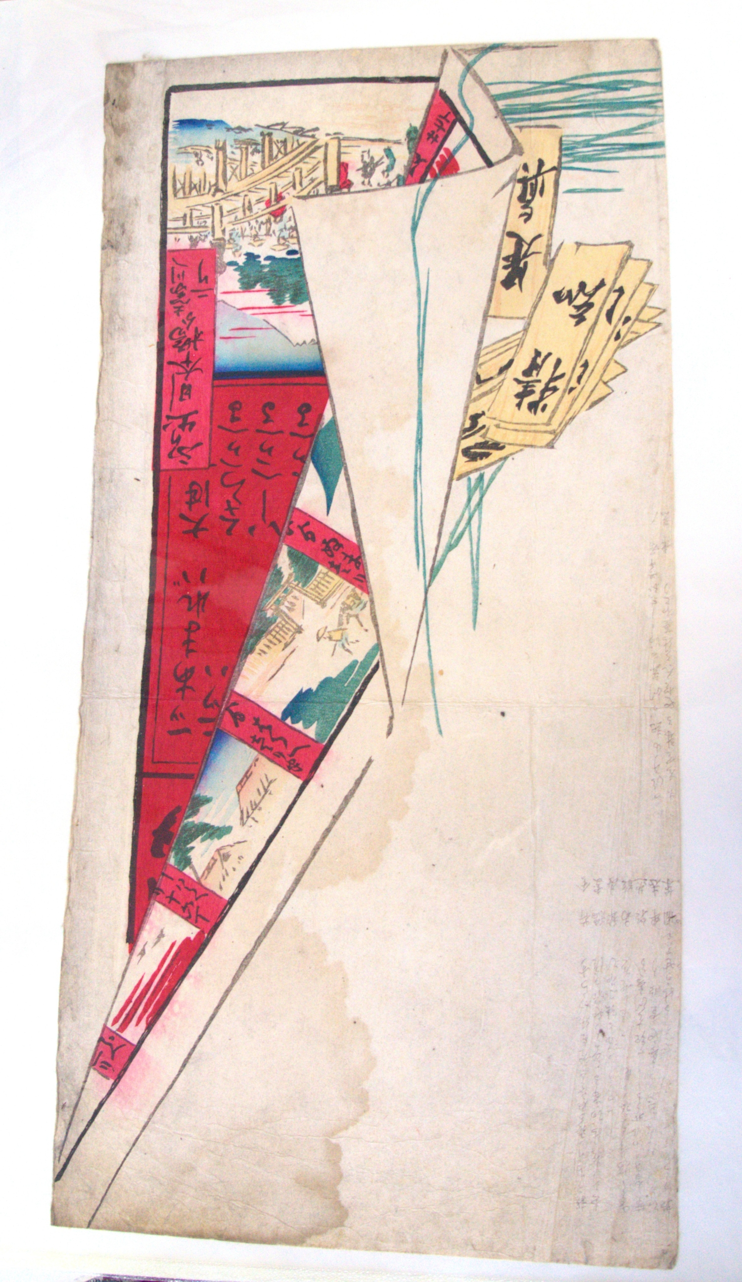 Vorhanden sind: I. Miyagi Gengyo. Titelblatt von "Einhundert Ansichten berühmter Orte in Edo". 1858. - II. Tokio Meisho. Die fünfzigjährige Geschichte der Kaiserlichen Universität. Um 1880. - III. Kabuki Masks. 20. Jahrhundert. - IV. Kirschblüten. Straßenszene. Um 1900. - V. Kunichika. Yaozen Restaurant in San'ya, von Kaika sanjuroku kaiseki. 1878. - VI. Kobayashi Kiyochika. Der verzweifelte Kampf von Hauptmann Asakawa in Tuchengzi. Triptychon. 1 (von 3) Ukiyo-e Farbholzschnitten. 1895. - VII. Mizuno Toshikata. Imasama Bijin. 1899. - VIII. Ochiai Yoshiiku. Aus der Serie Porträts als wahre Ebenbilder im Mondlicht (japonice: Makoto no tsukihana no sugata-e). 1867. - IX. Ogata Gekkô. Frauen bewundern Ahornbäume oder Azuma Nakanokimi aus der Serie "Gekkôs Sammelwerke" (japonice: Gekkô zuihitsu). 1892. - X. Derselbe. Staatsmann Takenouchi Sukune aus der Serie "Gekkôs Sammelwerke" (japonice: Gekkô zuihitsu). 1887. - XI. Derselbe. Zwei Frauen im Pferdestall aus der Serie "Gekkôs Sammelwerke" (japonice: Gekkô zuihitsu). Um 1890. - XII. Toyohara Kunichika. Schauspieler Bandô Hikosaburô. 1868.