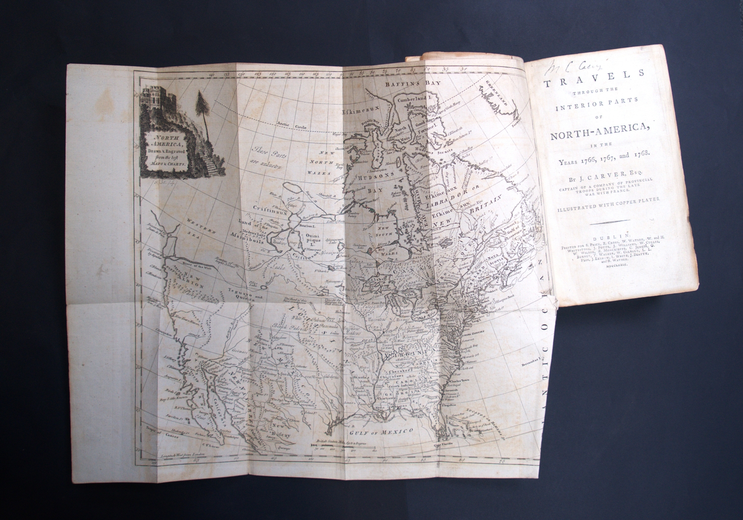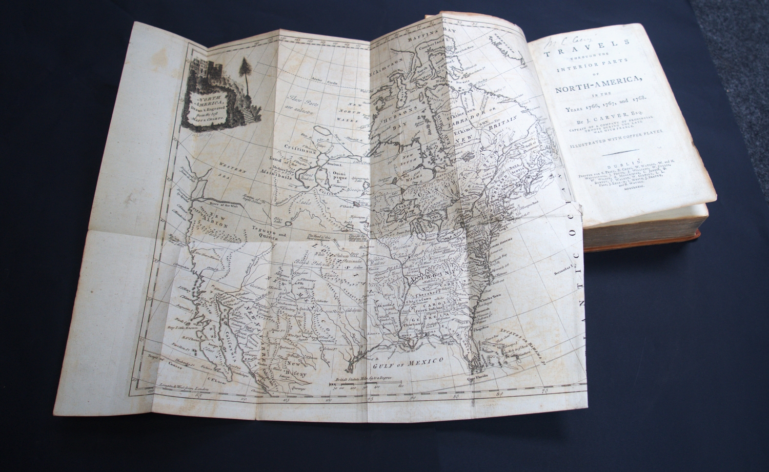 Carver, Jonathan. Travels through the interior parts of North America, in the years 1766, 1767, and 1768. 11 Bl., XIII, 508 S., 1 Bl. Mit 2, teils gefalteten Kupfertafeln und gefaltete Kupferstichkarte. 21 x 12 cm. Leder des 19. Jhr. (etwas berieben, bestoßen und leicht lichtrandig) mit goldgeprägtem RSchild. Dublin, S. Price, R. Cross, W. Watson etc., 1779.
