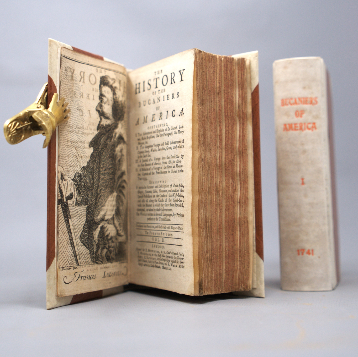 (Exquemelin, Alexandre Olivier). The History of the Bucaniers of America. Translated into English. The 4th edition. 2 Bände. 3 Bl., 354 S., 23 S.; 1 Bl., 406 S., 12 Bl. Mit 2 gestochenen Frontispices, 5 teils gefalteten Kupfertafeln und 2 gefalteten Kupferkarten. 16 x 9 cm. Modernes Halbpergament mit RTitel. London, D. Midwinter u. a., 1741.