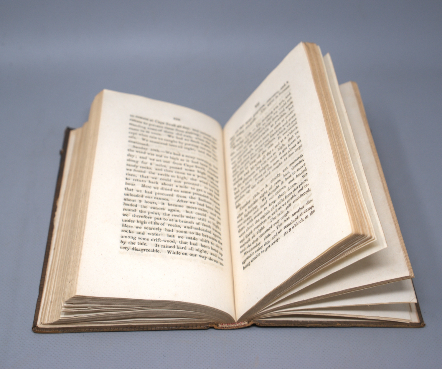 Gass, Patrick. A journal of the voyages and the travels of a corps of discovery, ... from the mouth of the river Missouri, through the interior parts of North America, to the Pacific Ocean during the years 1804, 1805, & 1806. IV, 381 S., 1 Bl. 21,5 x 13 cm. Pappband d. Z. (berieben, bestoßen, fleckig und mit Fehlstellen) mit goldgeprägtem Rschild, RVergoldung und goldgeprägten Stehkanten. London, J. Budd, 1808.
