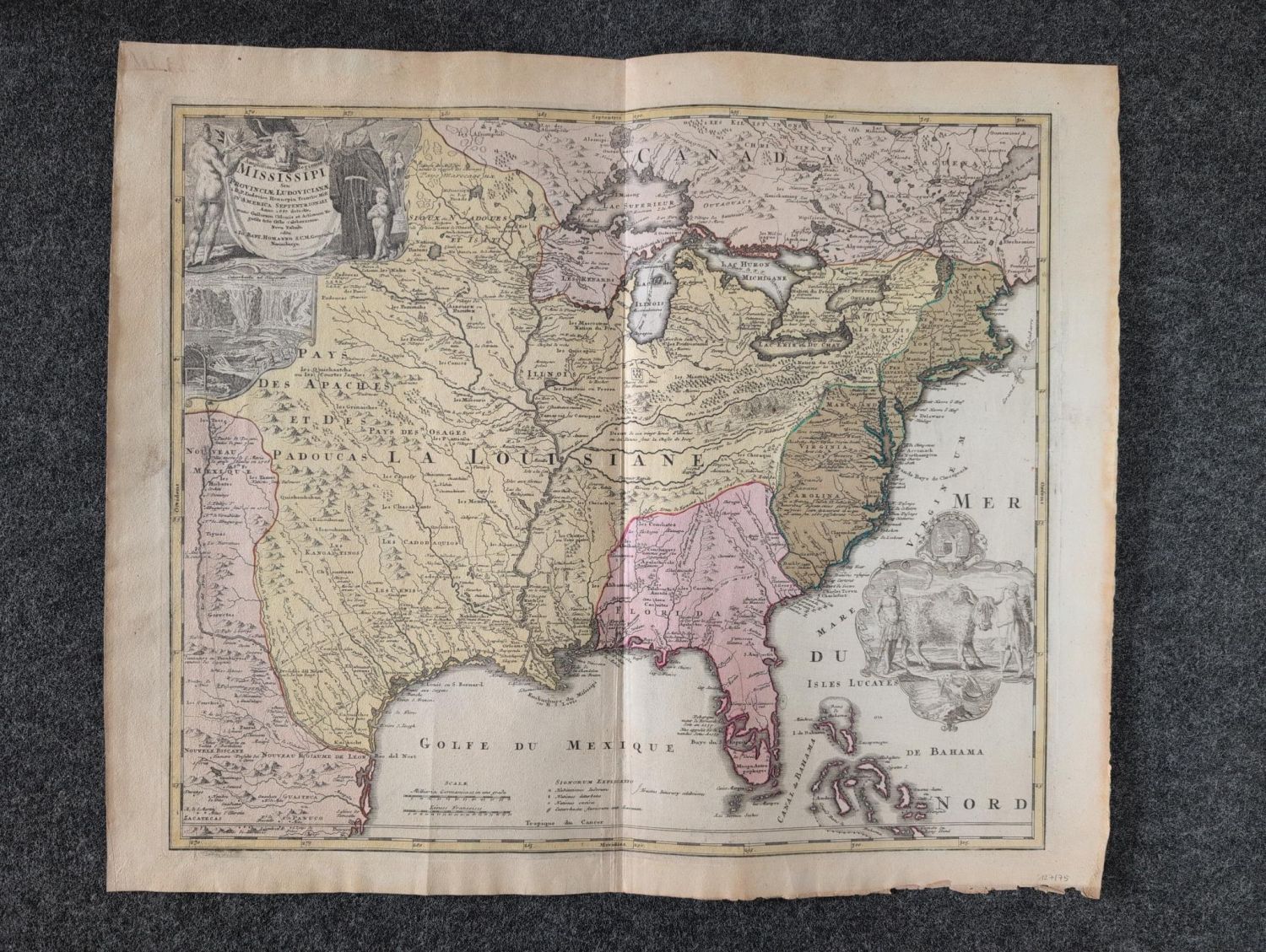 Die Karte von Johann Baptiste Homann (1663-1724) zeigt die Ostküste Nordamerikas. Dargestellt ist Florida, Carolina, Virginia, New York, Louisiana und Kanada. Mit großer figürlicher Titelkartusche – Mit Mittelfalz, mit leichten Randläsuren und etwas gebräunt. Dekorativ.