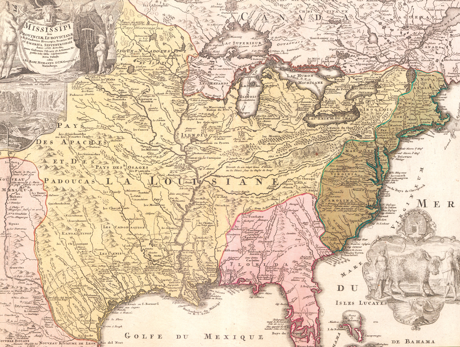 Homann, Johann Baptist. Amplissimae Regionis Mississipi seu Provinciae Ludovicianae à Hennepin. Grenz- und flächenkolorierte Kupferkarte. 49,5 x 58,5 cm (Plattenrand) bzw. 55 x 65,5 cm (Blatt). Nürnberg 1720-1763.